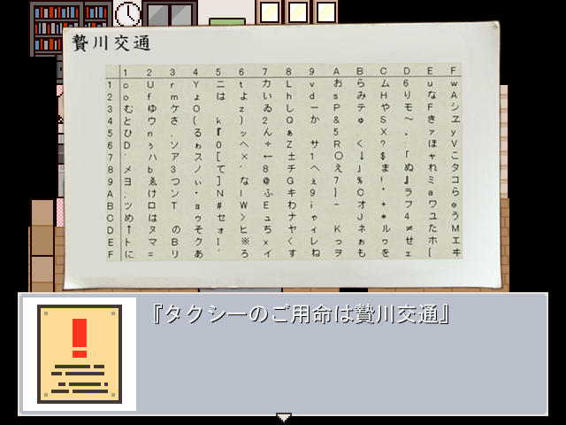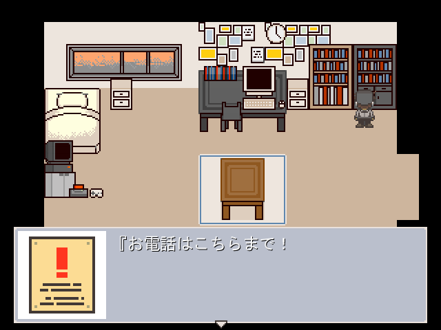 ウディタゲーの方ですがやっと作り終わりそうなので紹介しておきます。 いろんな場所に電話をかけて回るゲームです。 スタートは電話交換所(でも内装は普通の建物)。 主人公(とチップ)は変わらずですが、 今回は記憶がさっぱりないそうです。 あと喋らない。彼が記憶を取り戻さないと皆ちょっと困るらしい。 番号は行く先々で会う人々から教えてもらったり、 暗号などから算出したりして思い出していきます。 番号は43?42?くらい?あります(曖昧)。全部にかければクリア。 内線を除くと5桁-7桁-7桁なので覚え辛くなってます。めんどくさいです。 つってもストーリーはないようなものなので ひたすら電話をかけ続けるだけのゲームと言ってよいでしょう。 面白いかと言われると私は好きですとしか言いようがないけど メモと電話に喜びを感じる人はどうぞ(いるのか)。 コンセプトには元ネタがありまして、 ちっちゃいエイリアンのミニゲームと、ガラケー時代のアプリゲー。 前者は提示された短い(4桁?)番号を素早く入力して、 次から次へとつなげていくだけのゲームです。 最後の方になると時間制限がかなりシビアだったり。 それから後者は本当にガラケーが折りたためるか たためないかくらい昔なので詳細がまったくわからないんですが、 ものすごいそっくりなゲーム。あったはず! 機械の仕組み系は死ぬほど疎いんですが、 なんか昔から電話好きでして、2つともすごいツボだったんですよ。 (以前作って未公開状態の短編RPGも、電波とかそのあたりが 重要になっていくものでした。そしてブログタイトルも・・・) どちらかというとアプリゲーの方が理想に近くて、 もう見つからんから何番煎じかわからんが作ったろと思って・・・。 そういえばマザーとかも電話だったなあ。 やっぱりゲームで電話っていいなあ。 とりあえずテストプレイは終わってるので あとは微調整して不眠ゲーと公開を検討します。 しかし公開したところで 一体この世界の何人がプレイするのだろうか・・・(辺境)。 最初に比べるとえらい削られてますが、そのうち キャラ紹介とかの仕様もこっちのゲームに合わせようかなあ と思っています。 なにせマップとキャラチップがほぼ使い回しなので (あとは新規追加分のみ)前回とほとんど見栄えが変わらないんですが とりあえずスクリーンショット。 基本的に行き先にヒントがありますが、 どこどこに繋げられるよ~~としか教えてくれない人々もいたり、 イベント中セリフが変わって聞けなくなってしまうこともあるので、 わからなくなったら先述の電話交換所に戻って 先に別のところを回ってみるといいかもしれないです。 なんとなく気に行ってるマップ。 でもヒントの配置は適当。 最初はふざけてんのかって番号が3つ提示されるんですが その連絡先のうちのひとつ。 ピンポンして住人に番号を尋ねましょう。 暗号を解く為の表。 なんか知らないけど合間合間が抜けてたので修正してます。 ちなみに暗号の難易度ですがそんなに難しくないとは思います。 ひたすらにめんどくさいけど一回解いたらそれっきり。 数も少なめ。 PR |